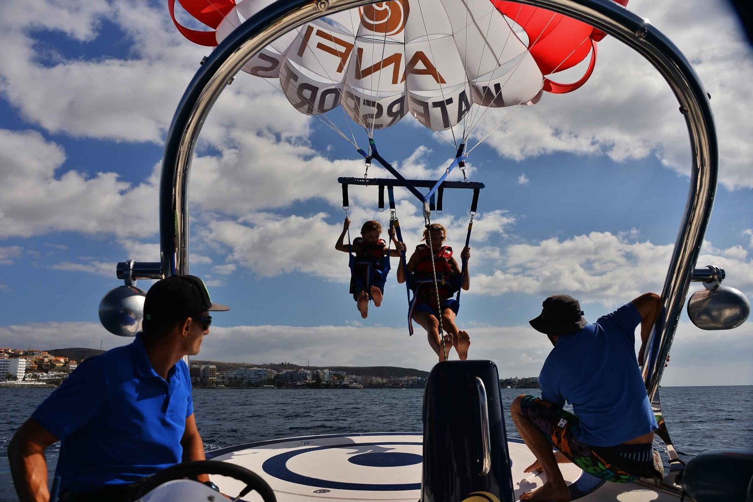 Disfruta de vistas despejadas de Gran Canaria a vista de pájaro mientras vuelas sobre el mar acompañado de uno o dos amigos en esta impresionante aventura de parasailing.