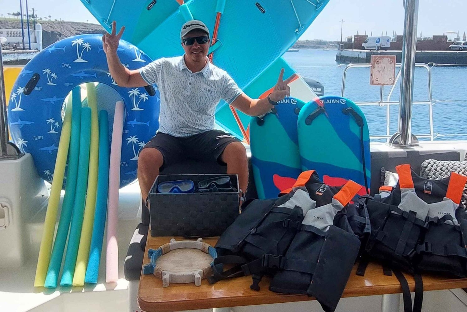 Natación, snorkel, paddle surf, tomar el sol y relajarse. • Todo el equipo acuático: 2 tablas de paddle surf + equipos de snorkel (máscaras y tubos) ♂️ • Altavoz Bluetooth para tu música. • Duchas de agua dulce y aseos privados. • Servicio de recogida y regreso incluido (Bahía Feliz → Puerto de Mogán).