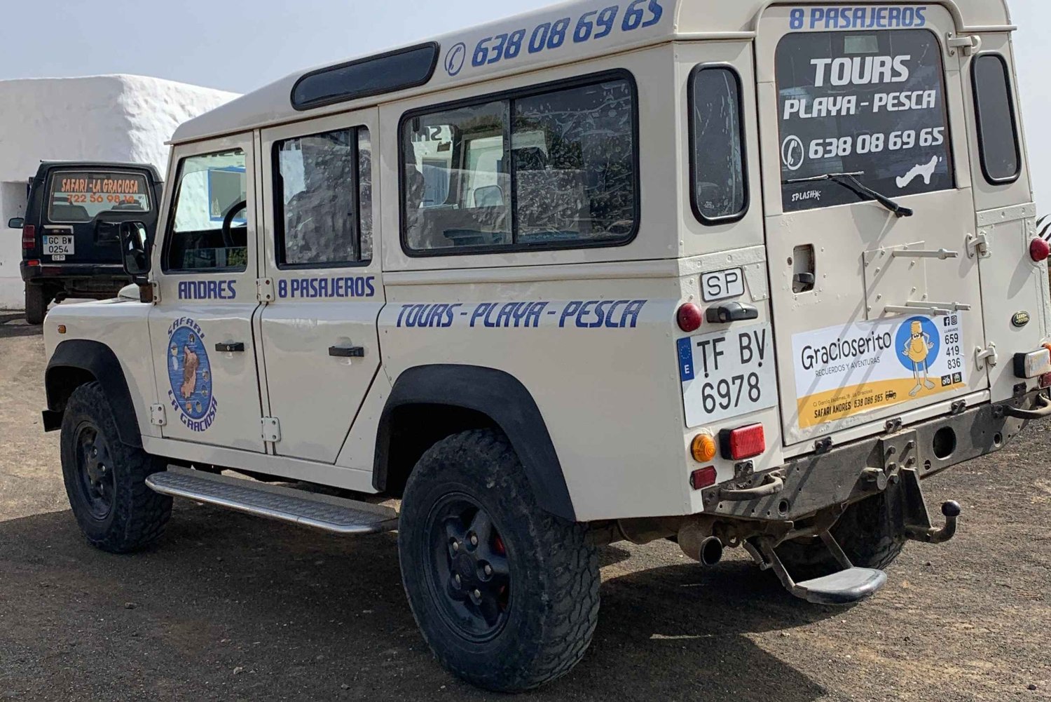 Disfruta de una excursión llena de emoción y diversión por la increíble isla de La Graciosa. – En Jeep Safari Andrés, frente a la iglesia de Caleta del Sebo, a solo 200 m a pie del ferry. 3 excursiones al día a las 10:30, 12:30 y 14:30. Máximo 22 personas divididas en 3 jeeps diferentes 6+8+8.