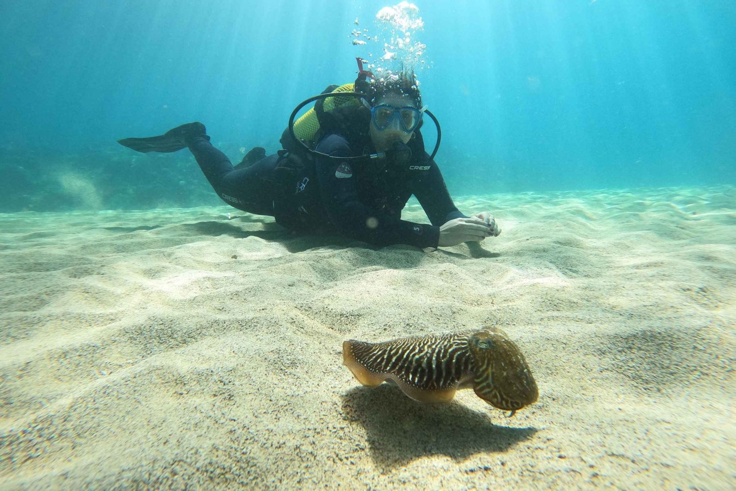 Uno de nuestros simpáticos y profesionales instructores te dará una breve introducción a los principios básicos del buceo, incluyendo las normas de seguridad, una descripción general del equipo y la comunicación bajo el agua. Una vez que te sientas cómodo, te llevaremos a un lugar de buceo tranquilo y poco profundo, ideal para principiantes, donde practicarás algunas habilidades sencillas en el agua antes de realizar tu primera inmersión real.