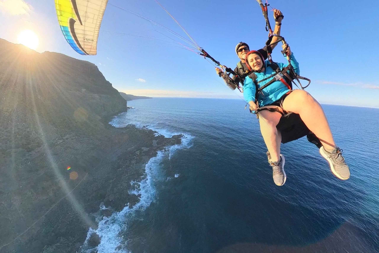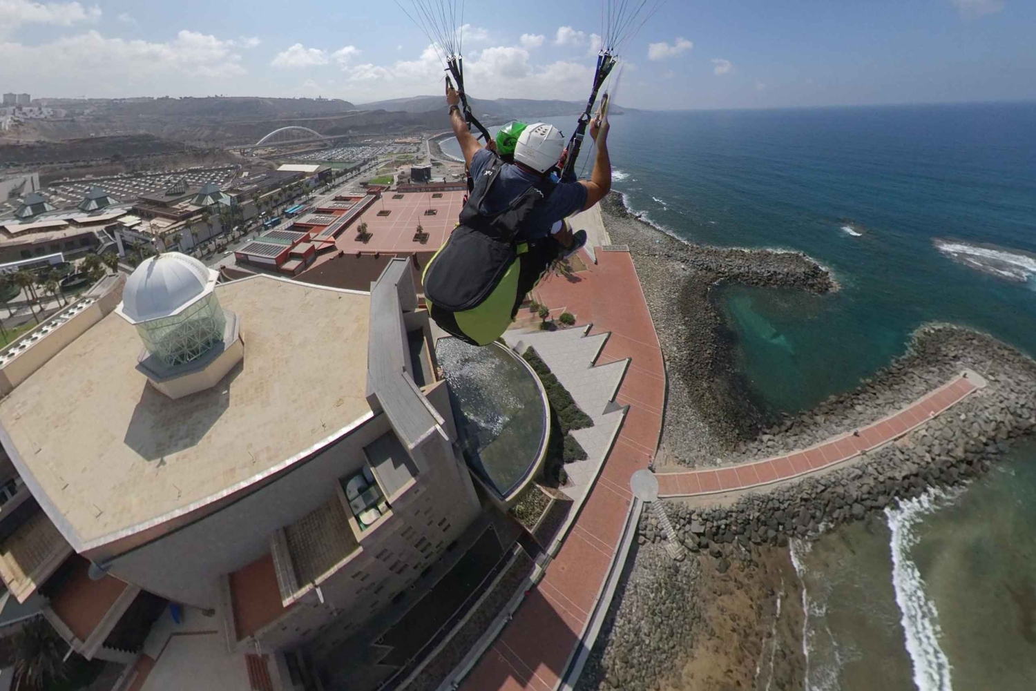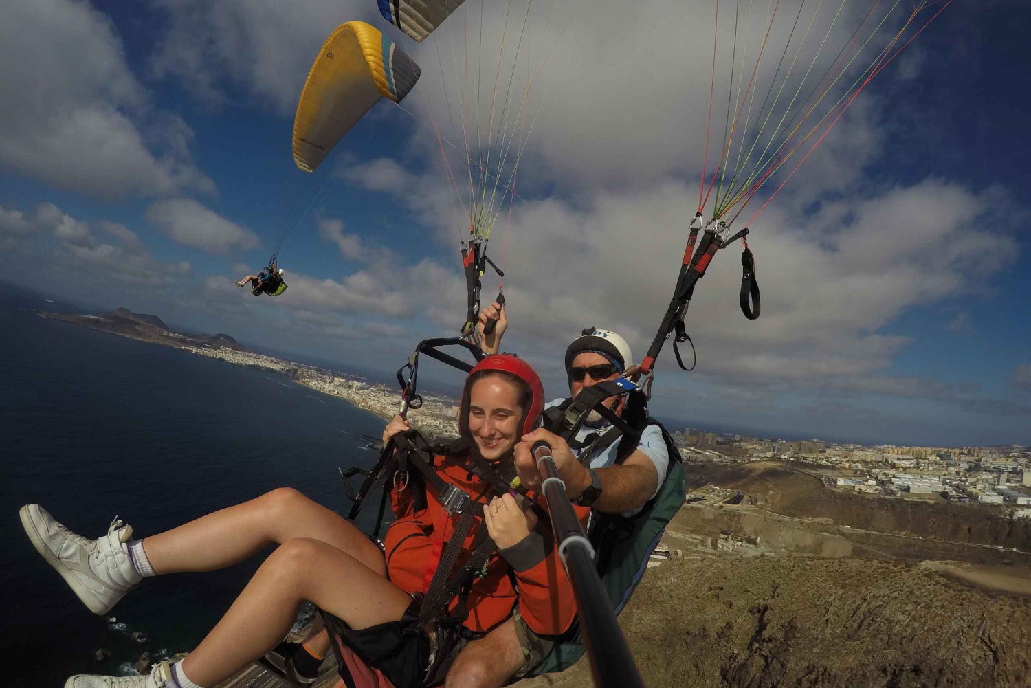 Disfruta de un vuelo en parapente de 20 minutos sobre la bahía de Las Palmas con un piloto experimentado. Te sorprenderá lo tranquilo y agradable que puede ser un vuelo con el viento laminar del mar.