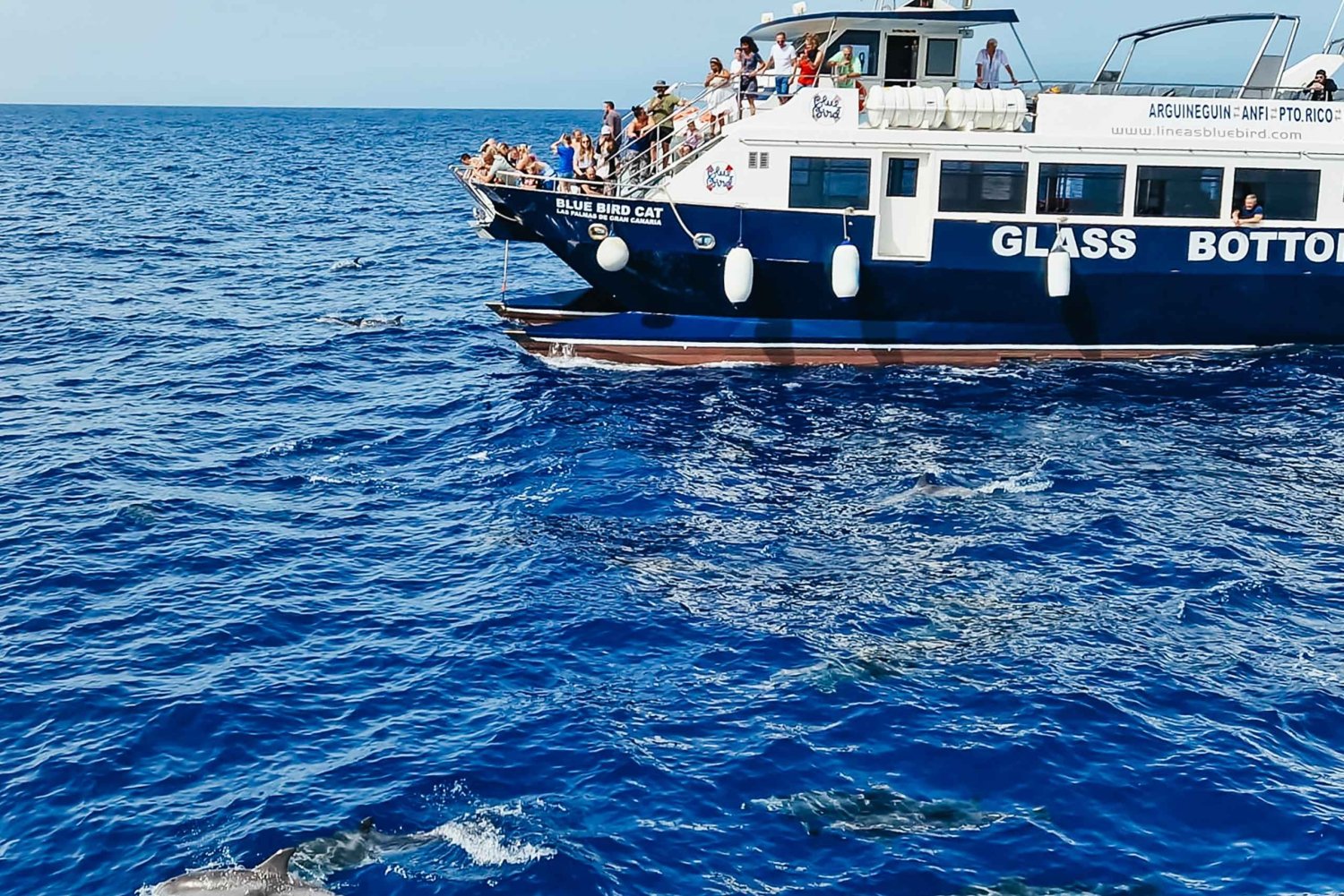 Board a catamaran in Puerto Rico de Gran Canaria and head out into the Atlantic Ocean in search of dolphins and whales. Marvel at picturesque views of Gran Canaria's coastline from the water, sip on complimentary soft drinks, and go snorkeling or swimming in the ocean. Your cruise begins with a convenient pickup from your hotel and transportation to the Puerto Base harbor, where you'll board your boat. You can also book the option without shuttle bus for a cheaper rate. Then, set sail to explore the waters off the coast of Gran Canaria, going in search of dolphins, pilot whales, minke whales, and more. Watch from the deck or through the glass panels below deck, keeping an eye out for these magnificent creatures and other aquatic life. Then, get ready to experience the ocean firsthand as your boat anchors in one of the small bays along the coastline. Go for a swim, enjoy some snorkeling, or make use of the onboard toboggan slide. If you prefer not to get wet, just sit back and relax, admire the view, and sip on a complimentary soft drink. Spend around 30 - 45 minutes enjoying the ocean before your cruise continues with a return journey to the harbor. As the mainly intention of the activity is watching cetaceans, this bath time could takes shorter if the searching of the wild life requires more time than usual. . Your bus will be waiting at the harbour to take you back to your accommodation.